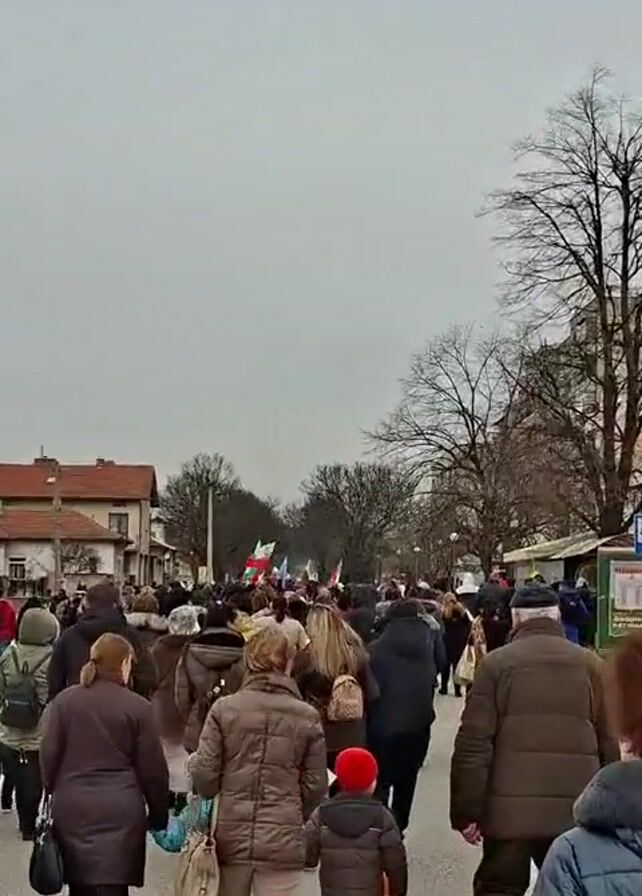 The video depicts a crowd of people walking down a street. Most of the people in the crowd are wearing jackets or coats, suggesting the weather is cool. The crowd includes adults and children. Some people are carrying Bulgarian flags. The street is lined with buildings and bare trees. The sky is overcast. The camera moves forward with the crowd.