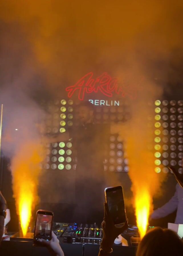 DJ performing at a nightclub called "Aurora Berlin." The DJ is standing at his console with his arms raised in the air. There are orange flames shooting up on either side of the stage. There is smoke in the air, and the backdrop is a wall of lights. The audience is holding up their phones to record the performance.
