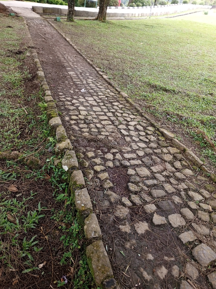 A stone pathway, constructed from rectangular and square stones, stretches through a grassy landscape. The path is bordered by larger stones, some covered in moss, separating it from adjacent areas of dirt and grass. The grass is green and lush, while the pathway appears worn with dirt and debris filling the spaces between the stones. Trees are visible in the background, further suggesting an outdoor park or garden setting.