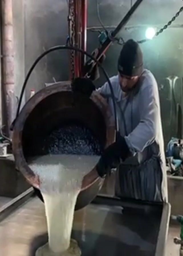 Here's a detailed description of the video: The video shows a production process, seemingly in an industrial or workshop setting. Three men are present. One man, wearing a beanie and gloves, is actively pouring a translucent, viscous liquid from a large, copper-colored cauldron into a rectangular metal container or trough. The cauldron is suspended by a chain hoist system. The liquid is thick and flows steadily. Two other men stand nearby, observing the process. One man stands with his arms crossed. The environment includes a cement floor, cinder block walls, and overhead lighting. Equipment, including a motor and a barrel, are visible in the background.