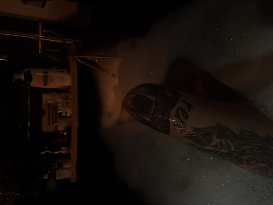 The image depicts a person's tattooed right forearm and hand partially submerged in a bubble bath within a dimly lit bathroom in Givatayim, Israel