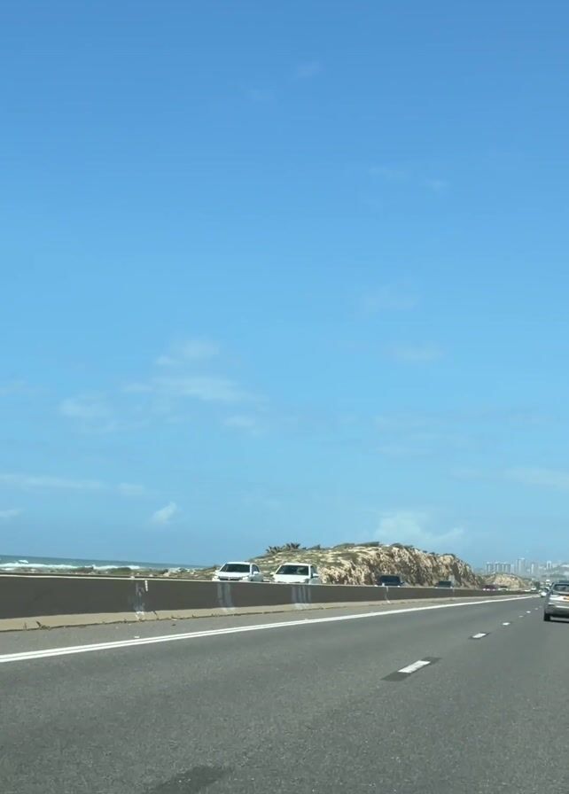 The video depicts a view from inside a moving car on a highway. The road is straight, with white lines marking the lanes. To the left of the highway is a concrete barrier, beyond which there is a sandy beach and the ocean. The water is a light turquoise color and there are gentle waves. The sky is bright blue with scattered white clouds. Several cars are visible on the highway, moving in the same direction.