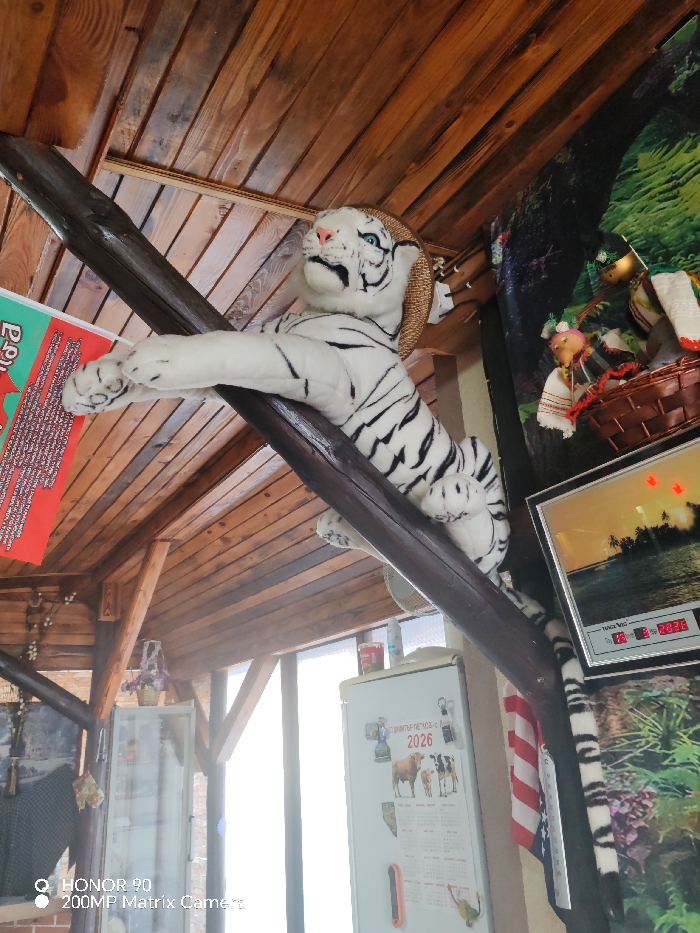 The image displays an interior scene within an establishment located in Rosen, Bulgaria. A large white tiger plush toy, featuring black stripes and blue eyes, and wearing a small straw hat, is centrally positioned. It rests on a substantial dark brown wooden beam that angles from the upper left to the lower right. The ceiling is constructed from light brown wooden planks, and additional dark wooden structural beams are visible, contributing to a rustic aesthetic. To the left of the tiger, a red sign with white Cyrillic text is partially visible. The background on the right side features a wall adorned with green jungle-themed wallpaper or a mural. Below this, a framed landscape photograph depicts palm trees silhouetted against an orange sky over water. Mounted beneath the photograph is a white digital display unit showing numerical values, including "20:36". To the right of the tiger, a woven basket contains several small, traditionally dressed dolls or figures. Below the main wooden beam, to the right, a white refrigerator is visible. It is decorated with magnets and a 2026 calendar featuring images of cattle. A miniature American flag hangs vertically adjacent to the refrigerator. The scene is illuminated by bright natural light originating from a large window or opening on the right side, indicating a daytime setting within a decorated indoor space.