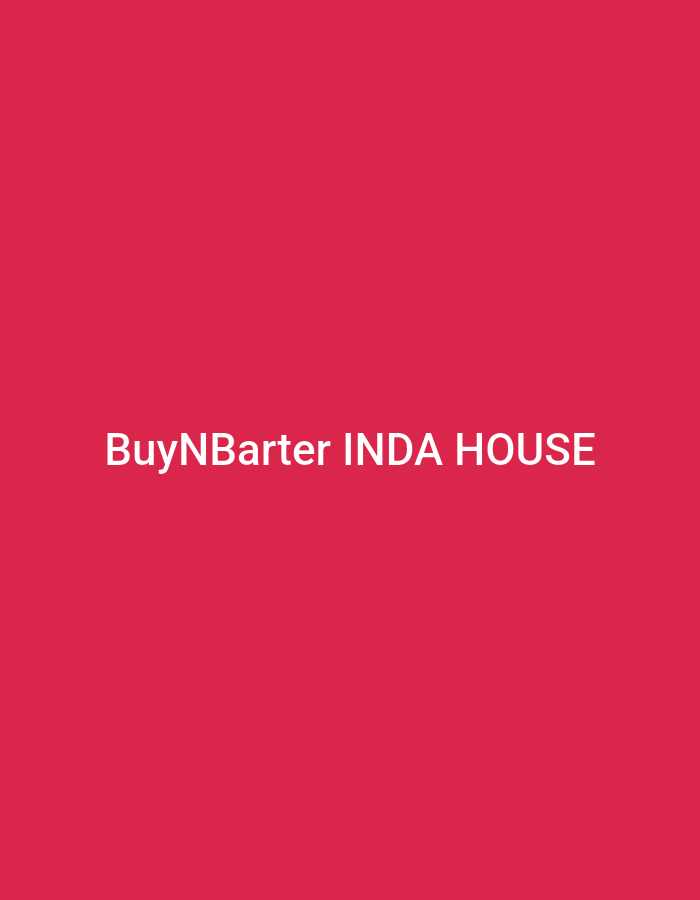 A digital image features a solid red background, likely for graphic design or branding purposes. Centered vertically and horizontally is the text "BuyNBarter INDA HOUSE" in a sans-serif typeface. The text is white, providing a stark contrast to the red background. The simplicity suggests an emphasis on the text itself as the primary element. The composition lacks other visual elements.