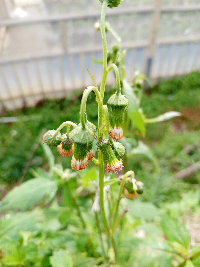 A slender green stalk rises vertically, adorned with nodding, bell-shaped seed heads. The upper portion of each head is green, transitioning to a fringed, cream-colored base, tipped with reddish-brown. Delicate white hairs extend from the fringe. The plant is surrounded by foliage and set against a blurred backdrop of greenery and a metallic structure.