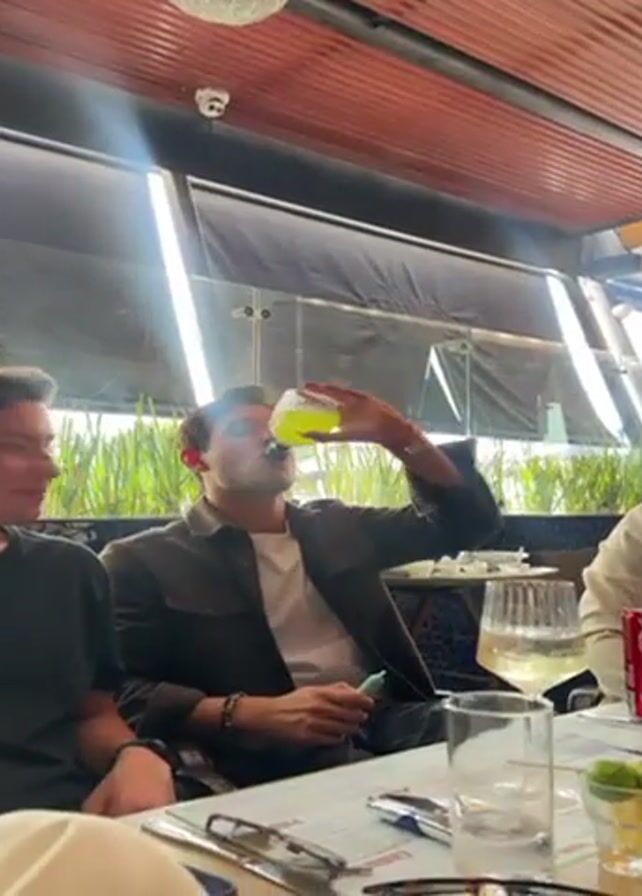 Three people are seated around a table in an outdoor restaurant. The person in the middle, a young man with dark hair, takes a long swig from a glass bottle containing a bright green liquid. A young man sits to his left, and a partially visible person sits to his right. A can of Coca-Cola, a glass of white wine, glasses, utensils, and a menu are visible on the table. The restaurant has an open-air feel with a partial roof, pillars, and greenery in the background. Bright sunlight streams in.