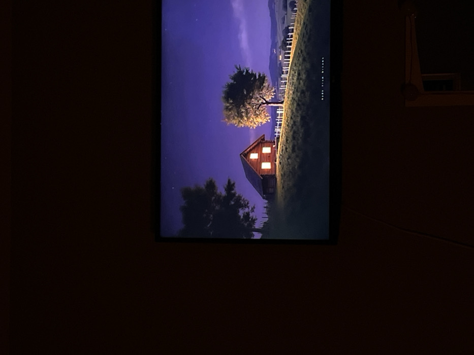 This image, captured in the city of Samovodene, Bulgaria, depicts a brightly illuminated display screen positioned against a dark brown wall in a dimly lit interior space. The screen exhibits a stylized nocturnal or twilight landscape. A rustic, single-story wooden cabin, illuminated by warm orange light emanating from three visible windows, is situated on a grassy incline. To the left of the cabin, a dark, silhouetted tree stands. To the right, a second tree features brightly lit, golden-hued foliage. A white picket fence stretches across the midground, traversing the crest of the hill. In the background, rolling hills with scattered faint lights are visible under a deep purplish-blue, star-dusted sky. The text "PURE FROM DREAMS" is faintly discernible near the bottom center of the screen. A light-colored cable extends diagonally from the lower left side of the screen frame. A fragment of a light-colored, framed object is partially visible in the bottom right corner of the photograph, subtly illuminated by the screen's glow. No people are present within the depicted scene or the immediate foreground.