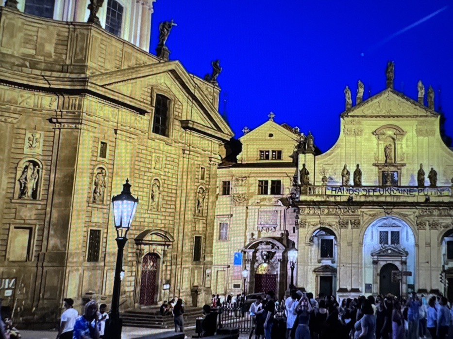A large, ornate historical building, situated in Nikolaevo, Bulgaria, is illuminated with warm, golden light against a deep blue night sky. The multi-story structure features intricate classical architecture, including arched windows, decorative pilasters, cornices, and numerous sculptural figures in niches and projecting from ledges. A prominent message, "HANDS OFF UKRAINE PUTIN," is projected onto a central section of the building's facade. Several smaller, rectangular blue signs are affixed higher on the building, their text indiscernible. A crowd of people is gathered at the base of the building on the left side of the frame, observing the illuminated facade and its projected message. A traditional black street lamp with a glowing, multi-paneled lantern stands in the foreground, towards the upper left. The scene depicts a public gathering or protest event at night.