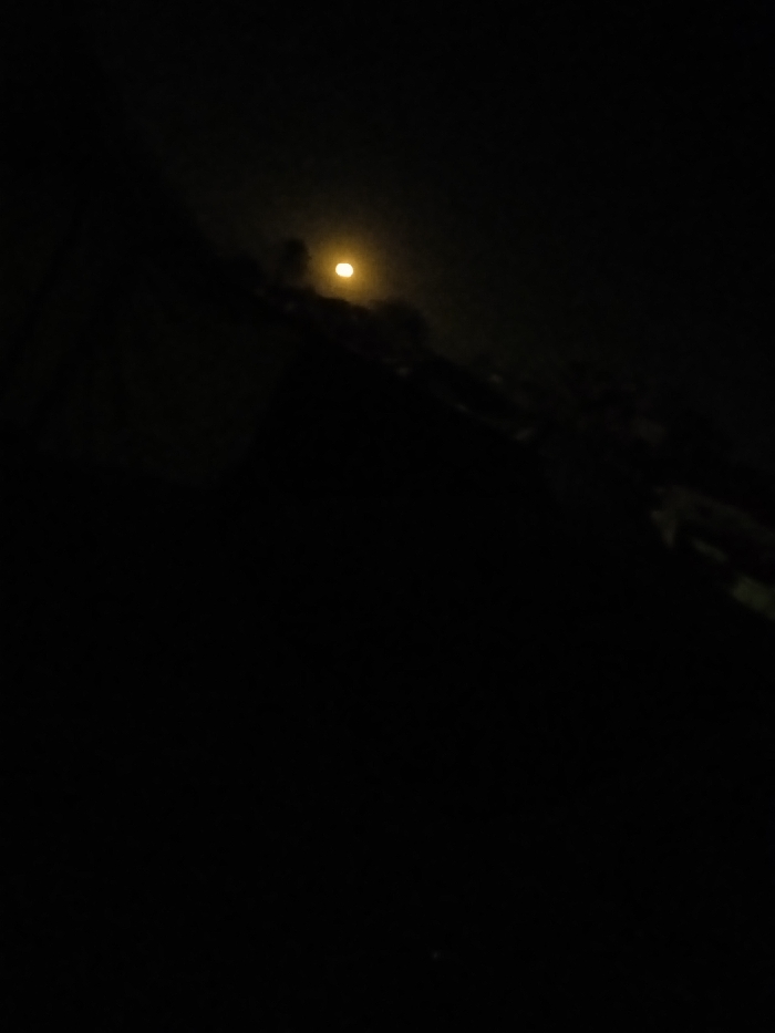 The image portrays a nighttime scene in Al-Mawasi, Palestinian Territories, characterized by extremely low light conditions. A single, prominent, circular light source, exhibiting a yellowish-orange hue, is visible in the upper-left quadrant, consistent with the moon or a distant artificial lamp. Faint, dark, amorphous silhouettes, possibly indicative of trees or architectural elements, are barely discernible directly below and to the right of this light source. The vast majority of the frame, particularly the lower and right portions, is undifferentiated black, signifying a profound absence of light and detail. No people, discernible actions, or specific objects beyond those mentioned are present.