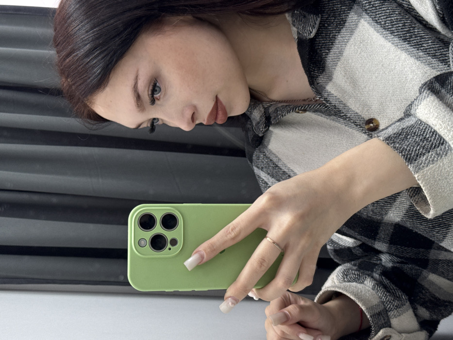 A young adult female is depicted in an indoor mirror selfie, taken within the city of Chaikovsky, Russia. Her upper torso, head, and right arm are visible. She has long, dark brown hair, light blue eyes, and wears noticeable makeup, including false eyelashes and brown lipstick. She is dressed in a black and off-white plaid flannel shirt, with a thin necklace partially visible. Her right hand, featuring long, square-tipped nails and a thin ring on the fourth finger, holds a light green smartphone with three camera lenses, aimed at her reflection. The background is an out-of-focus dark gray textured curtain or fabric.