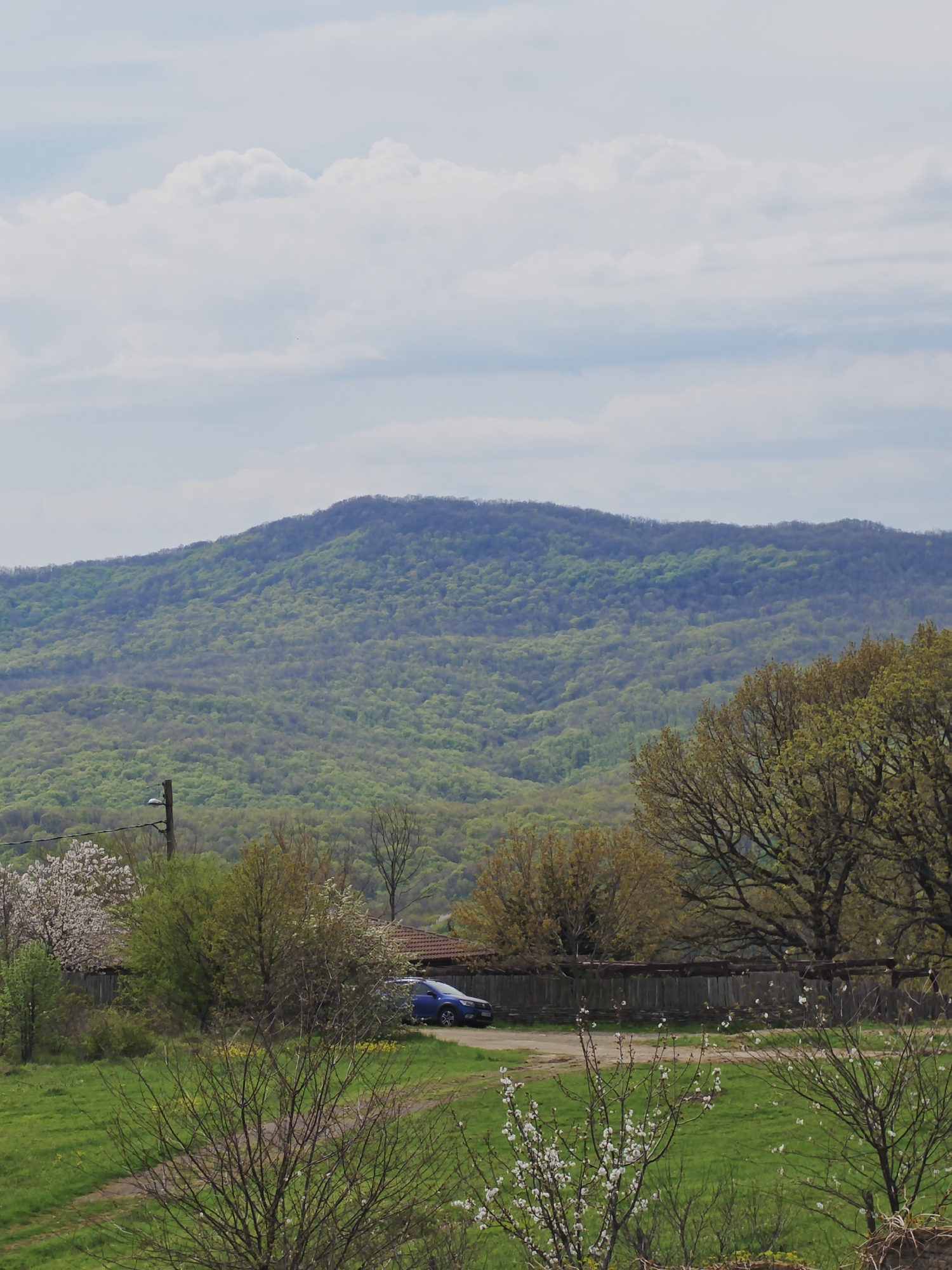 The image captures a landscape in Izgrev, Bulgaria. In the foreground, there's a grassy field with sparse, budding trees bearing white flowers. A dirt path cuts through the field. Beyond the field, a wooden fence runs horizontally across the midground, behind which is a blue car parked near a house. In the background, a densely forested mountain rises, its slopes displaying varying shades of green. The sky is partially cloudy with a pale blue hue. A utility pole is visible in the midground, near the house.