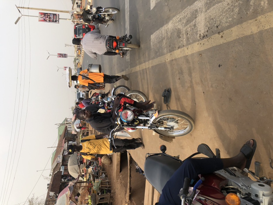 A bustling street scene shows multiple motorcycles parked or moving on a road. Several people are visible; some are on the motorcycles, while one carries containers on their head. Street vendors and shops line the side of the road, suggesting a market area. Overhead wires and billboards add to the chaotic yet vibrant urban environment. The photo is taken from a slightly elevated position, possibly from another vehicle or building.