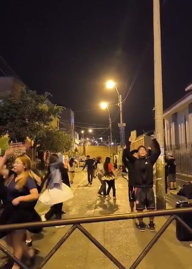 At night, a group of people in casual clothing dance to music in the middle of a street. Some hold up a white sheet and wave their arms in the air. They are in front of a metal barrier. The street is illuminated by overhead streetlights. There are buildings and a tree visible on the side of the street. Some people are standing by the sides, watching the dancers.