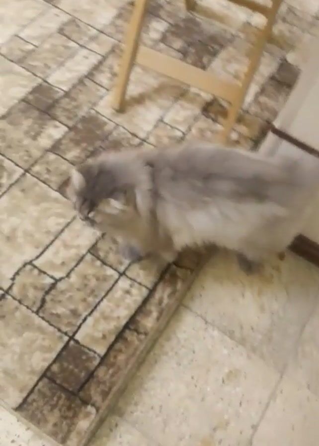 fluffy, light-gray cat walking on a brown-and-beige checkered rug. The cat then turns and meows near a wooden folding chair and a white cabinet. The room has beige tile flooring.
