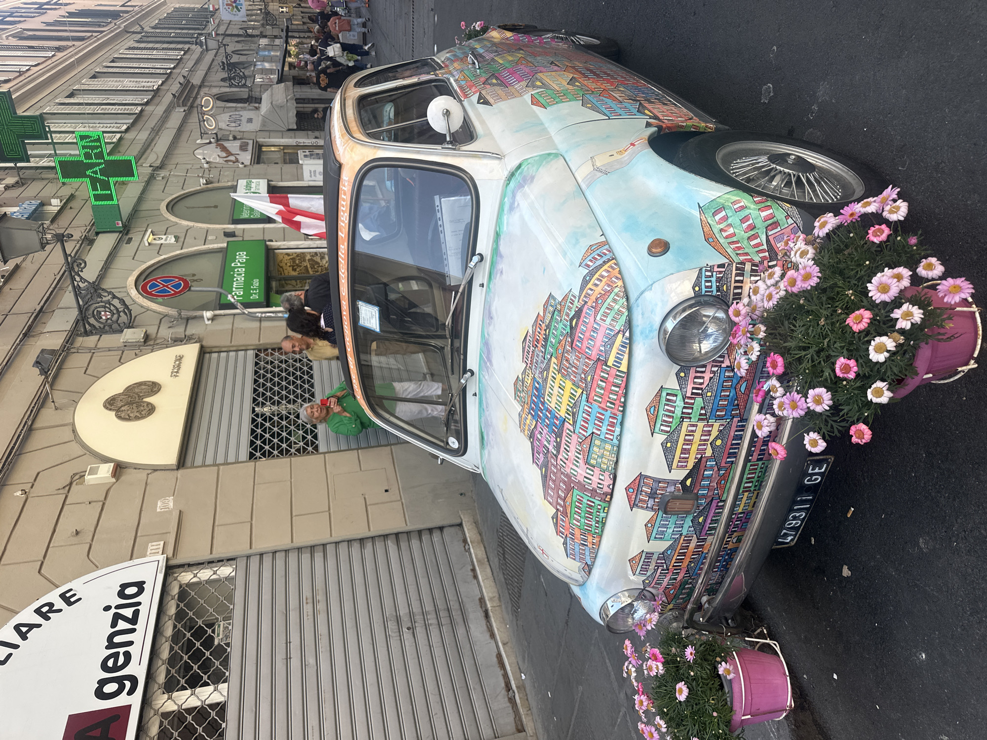 vividly painted vintage Fiat 500 parked on a street in Genoa, Italy