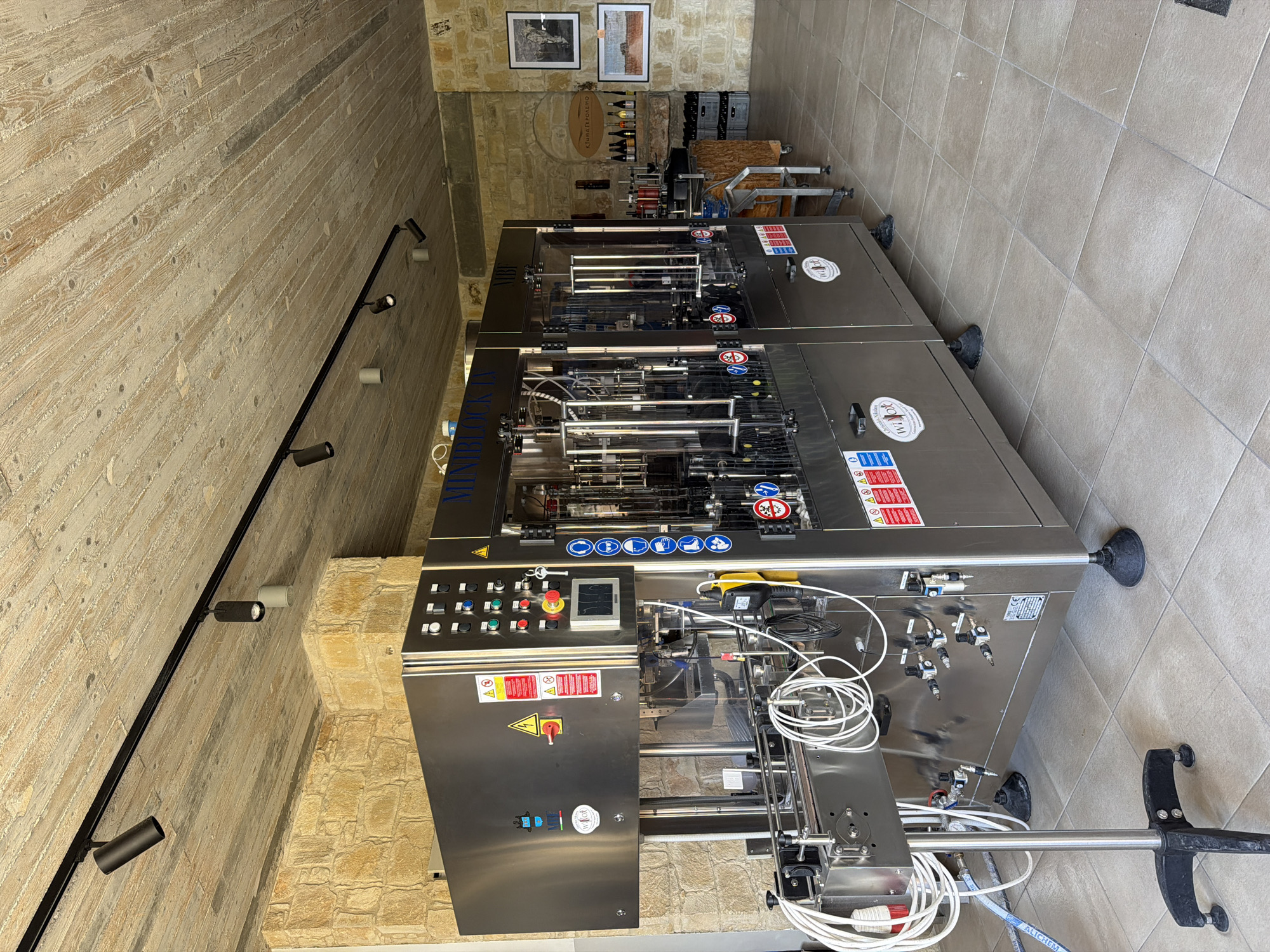 The image captures the interior of what appears to be a small-scale wine bottling facility located in Omodos, Cyprus