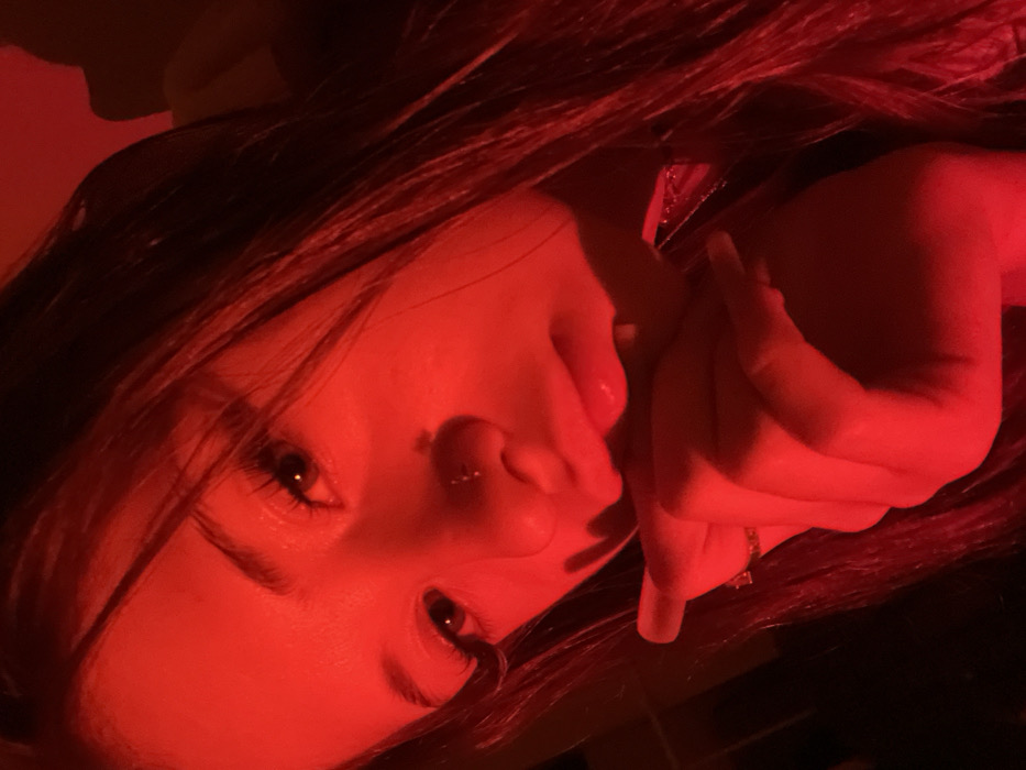 The image presents a close-up of an individual, appearing female, under intense red lighting