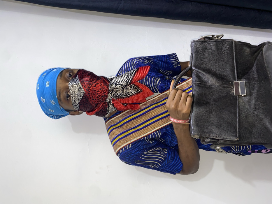 A person wearing a blue bandana, a patterned scarf covering their face, and a blue and gold striped shirt is holding a black leather briefcase. The background is a plain white wall with a strip of black fabric along the top. A pink wristband with text is visible on their arm. The image is oriented sideways.