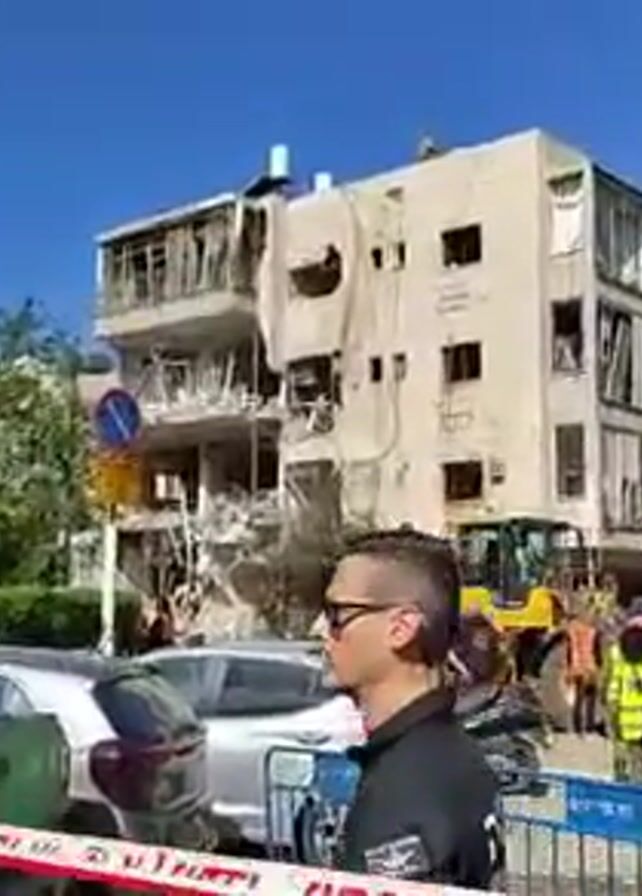 building that has been severely damaged, possibly by an explosion or some other kind of disaster. Parts of the exterior walls are missing, and debris is scattered around. There is a yellow backhoe on the street in front of the building. People in what appear to be safety vests or emergency personnel attire are gathered nearby. A man wearing sunglasses and a black shirt is in the foreground, looking towards the damaged building. A row of parked cars is also visible, with a red and white caution tape barrier partially blocking the view.