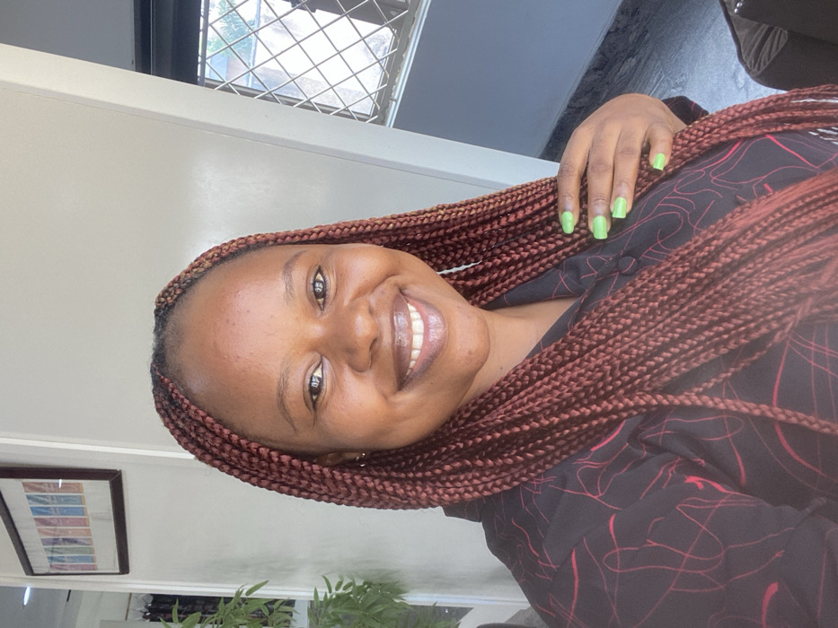 An adult female is depicted indoors in Gwarinpa, Nigeria. She faces forward, smiling broadly with visible teeth and glossy lips. Her hair is styled in long, reddish-brown box braids. She is wearing a black collared shirt with a red, wavy line pattern. A small gold hoop earring is visible on her left ear, and a thin white dangling earring is present on her right. Her left hand, with short, square-shaped fingernails painted light green, is positioned near her braids. The background consists of a light-colored wall. To the left, a dark-framed picture containing multiple colorful vertical panels hangs, and a partial view of a green potted plant is visible below it. To the right, a window with metal security bars reveals outdoor green foliage and a building structure. The scene is brightly illuminated, indicating natural light.