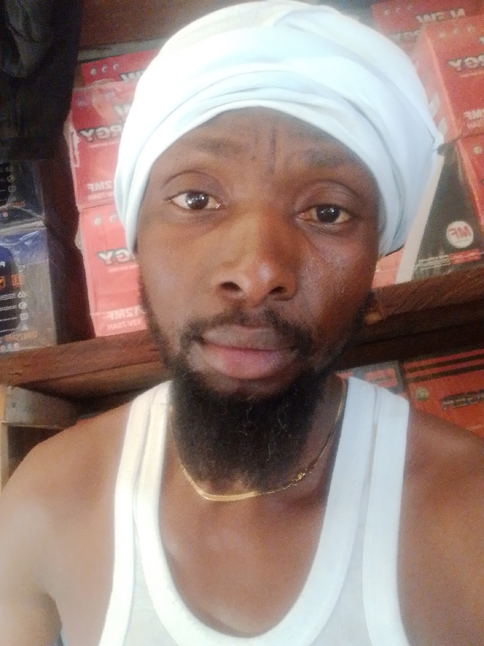 The image presents a close-up, head-and-shoulders shot of an adult male, taken indoors, likely within a commercial or storage area in Jos, Nigeria