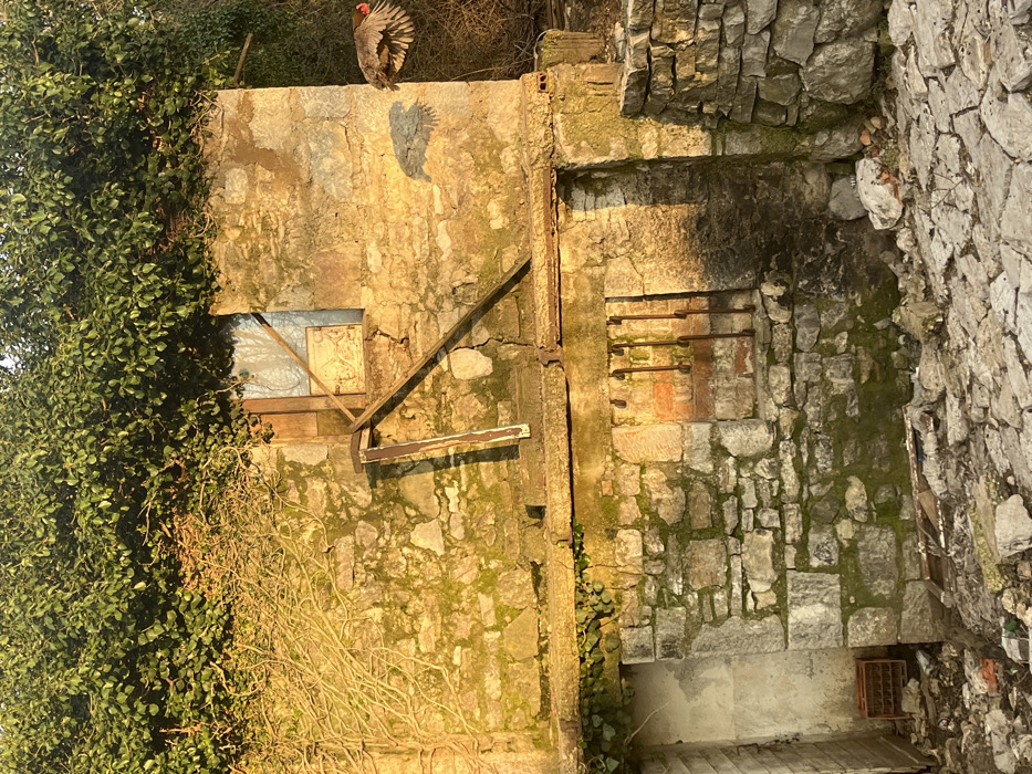 The image displays an exterior view of a two-story, weathered stone structure in Škaljari, Montenegro, illuminated by strong natural light. The upper level of the structure is constructed from irregular stone blocks, with visible moss and cracks. A rectangular window opening is present, featuring a broken wooden frame and an interior surface that reflects light. Two diagonal wooden or metal struts lean against the wall below the window. Dense green foliage covers the top edge and descends along the left side of this level, with a network of bare, gnarled branches intertwined on the left. The lower level, also built from irregular stone blocks, presents a rectangular opening on the far left, revealing a light-colored interior and a red plastic crate resting on the ground. To its right, a smaller, recessed opening contains three vertical rusted metal bars, exposing reddish brickwork behind them. The ground in the foreground is composed of uneven, light-colored stones, rubble, and scattered debris. In the mid-air on the right side of the frame, a chicken with brown plumage and visible red wattles/comb is captured in flight, its wings extended upwards. A distinct shadow of the chicken is cast onto the stone wall behind it. Sparse, dry vegetation is visible in the background on the far right.