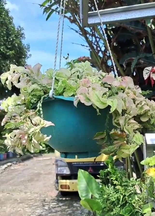 hanging planter with a light-green and white variegated plant in a turquoise-colored plastic pot. The pot is suspended from a silver metal frame by three white ropes. In the background, there's a yellow truck parked on a paved surface, along with various plants and trees. The sky is visible with a few scattered clouds.