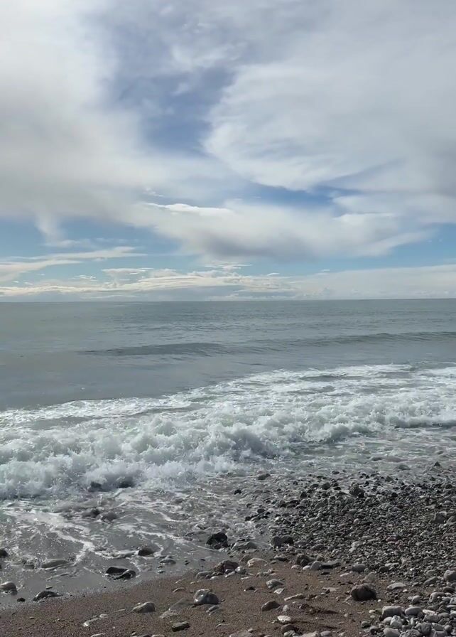 view of a rocky beach meeting a calm ocean under a partly cloudy sky. The waves are gentle, and the beach is covered in pebbles of various sizes. The clouds are a mix of white and gray, with patches of blue sky visible. There are no people visible in the video. The camera appears to be stationary.
