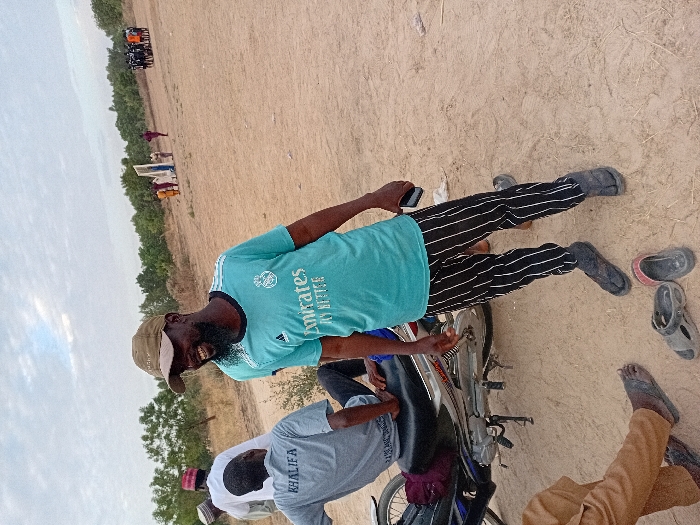 A group stands in a sandy, rural area. One man in a teal soccer jersey, black and white striped pants, and a tan cap holds a phone and smiles. Another man wears a gray "KHALIFA" shirt. A motorcycle is parked nearby. In the distance, a group stands near what looks like a soccer goal. The sky is overcast, and sparse vegetation dots the landscape. Extra footwear is scattered on the ground.