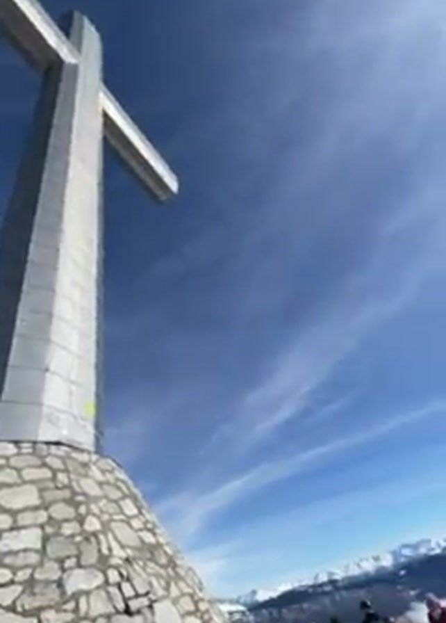 The video starts with a low-angle shot of a large, silver cross standing on a stone base against a clear blue sky with some wispy clouds