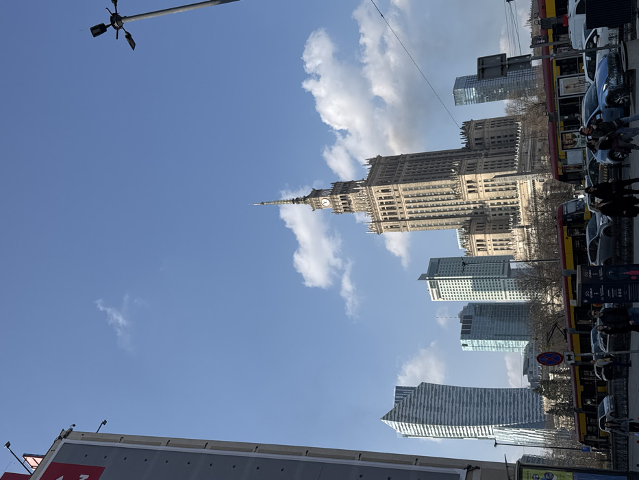 - "The image depicts a bustling urban street scene in Warsaw, Poland, dominated by the prominent Palace of Culture and Science under a clear blue sky with scattered white clouds" by FM-ngx9o2, licensed under CC BY 4.0