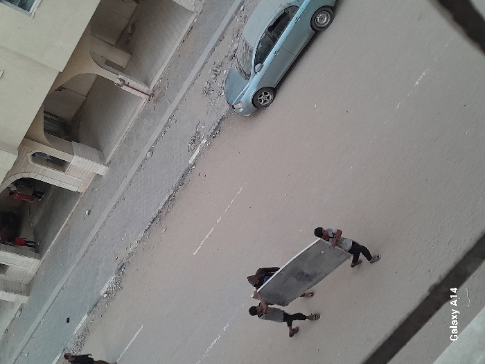 An oblique overhead view depicts a street scene in Khan Yunis, Palestinian Territory. A light-colored, multi-story building with arched ground-level entrances supported by pillars occupies the right side of the frame. The paved street features a broken white line. A light blue sedan is parked parallel to the curb on the right, facing left. Three individuals are actively carrying a large, rectangular, light-grey panel, approximately 2.5 meters long, horizontally across the street. Two males, one in a grey shirt and another in a dark hooded top, support the left end of the panel, while a third male, also in a grey shirt, supports the right end. In the background, one individual in dark clothing walks left on the paved sidewalk, which shows scattered debris along its curb. Two additional figures are partially visible near the building's arched main entrance, one wearing a red top.