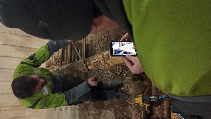 A worker wearing a green jacket and dark pants is holding a string measuring a damaged wooden structure. Another person is taking a picture or video with their smartphone of the worker and structure. A yellow and black power drill sits on the ground nearby. The scene appears to be inside a building under construction or undergoing repairs. One person is wearing a dark beanie.