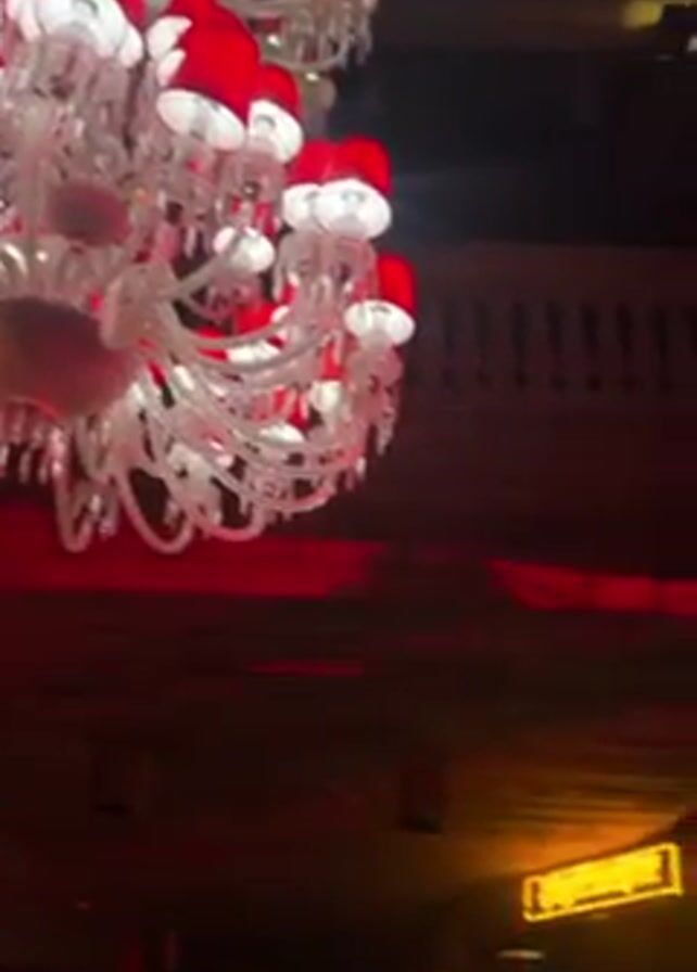 The video pans across the interior of what appears to be a club or bar, with wooden walls and ceilings, and a large chandelier with red shades dominating the view