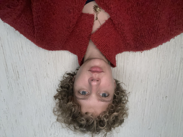 The image displays a close-up, frontal view of a single individual with light skin, blue eyes, and short, curly, light brown hair. The individual is looking directly at the camera with a neutral expression. They are wearing a textured, loose-knit, red cardigan or sweater featuring a wide, open collar. A gold-colored pendant, shaped like a stylized sun with radial rays, hangs from a thin chain around the individual's neck, partially visible beneath the cardigan. The background consists of a light-colored wall, likely white or off-white, exhibiting a distinct vertical textured pattern. The scene is indoors. No visual elements within the image identify its location as Mexico City, Mexico.