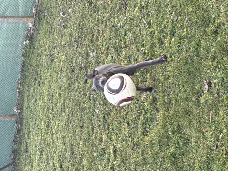 The scene depicts a dark gray dog holding a soccer ball in its mouth, situated in an outdoor, grassy area in Zornitsa, Bulgaria