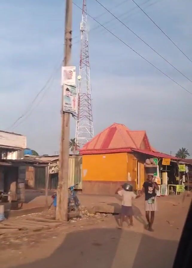 The video depicts a street scene in what appears to be a rural or developing area. A tall red and white telecommunications tower dominates the background. In the foreground are makeshift shops and stalls along the roadside. People are walking around, including one woman carrying a load on her head and a man riding a motorcycle. There are utility poles and power lines overhead. The overall scene suggests a bustling, but somewhat impoverished, environment.