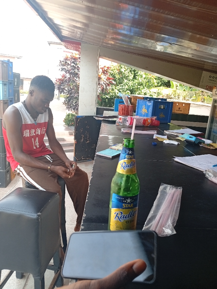 The image depicts an outdoor or semi-outdoor refreshment area in Onitsha, Nigeria, during daylight. A corrugated metal canopy extends over the scene. On the left, a dark-skinned male subject is seated on a black square stool. He wears a red and white sleeveless tank top with Chinese characters "瑞意商行" and the number "14". He has a close-cropped haircut, wears a necklace and a wristband, and looks downwards, holding a small, light-colored object in his clasped hands. To his left, several stacks of blue and brown beverage crates are visible. A dark counter surface occupies the middle ground. On the counter, a green glass bottle of "STAR Radler Citrus" with a blue and yellow label stands upright, containing a pink straw. Adjacent to it, a clear plastic bag holds multiple pink straws. Other items on the counter include a blue notebook, loose papers, and several red and white plastic cups. The background features lush green and reddish foliage, along with additional stacked crates. In the immediate foreground, a dark-skinned hand holds a black smartphone with a reflective screen, angled towards the scene.