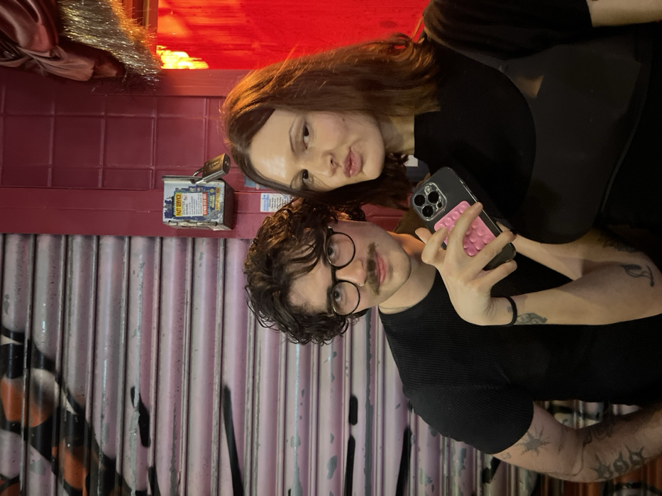 A person with dark curly hair and round glasses holds a phone, taking a selfie with another person