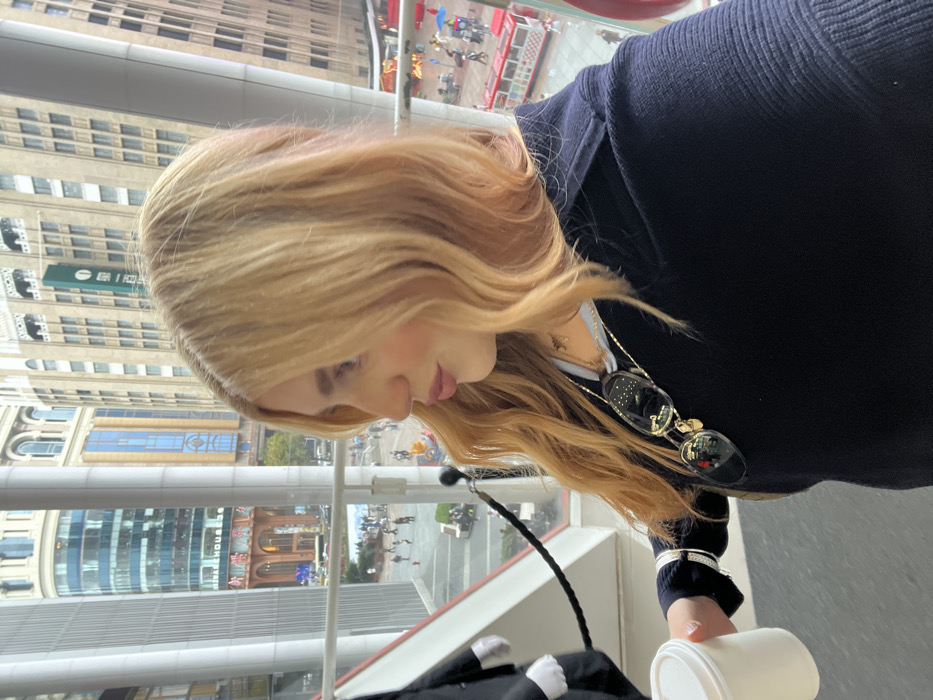 A woman with blonde, wavy hair looks down, holding a white coffee cup. She wears a navy sweater, a gold necklace, and has sunglasses hanging on her shirt. Outside the window, tall buildings are visible, along with people walking in a plaza. The photo is taken indoors, likely from a higher level, providing a view of the cityscape below.