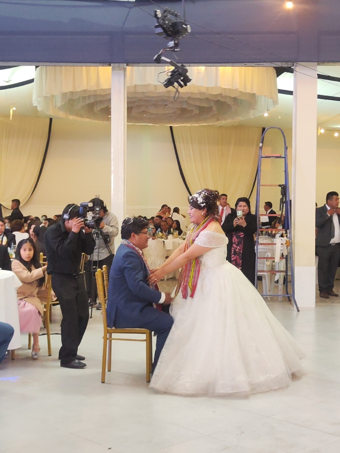 A wedding scene unfolds indoors with a bride and groom center stage. The bride, in a voluminous white gown, faces a seated groom in a blue suit, their hands clasped. A colorful sash drapes across both their shoulders. Two videographers document the moment, while a guest films with a phone. A young girl sits nearby. A ladder leans against a wall near the scene. Guests are seated at tables in the background. Above, a camera rig hangs from the ceiling.
