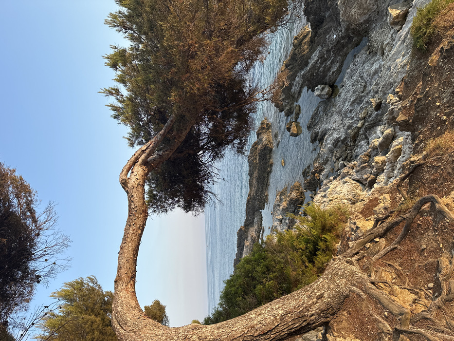 - "A gnarled, tan-barked tree with dense, dark green foliage leans dramatically over a rocky coastline" by FM-9swfd2, licensed under CC BY 4.0