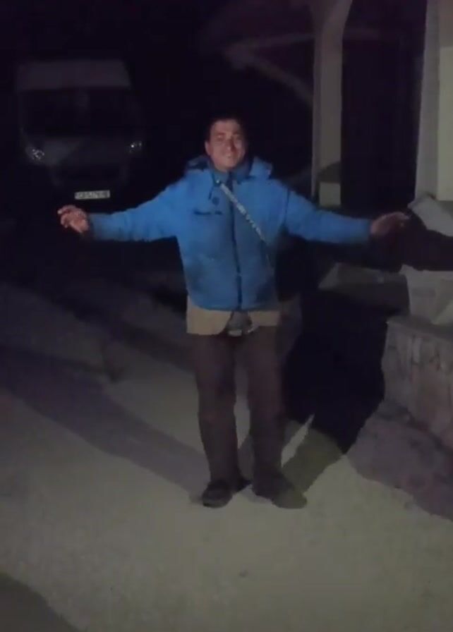 A man stands outside at night, his arms outstretched. He wears a blue jacket, brown pants, and dark shoes. A white van is parked behind him, and a building with a porch is to his right. The man's shadow is cast on the ground in front of him. The camera then points upward, showing an indeterminate object. Music is playing.