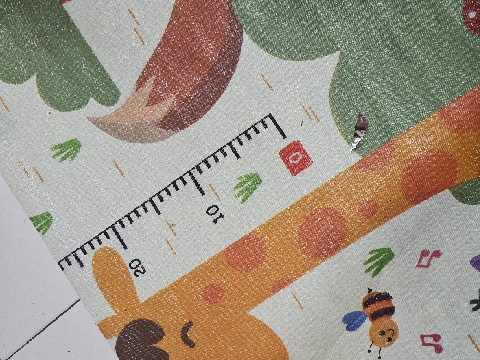 This is a close-up, oblique view of a patterned, glittery-textured mat, reportedly located in Muka, Indonesia. The mat features various cartoon illustrations against a light, off-white background. Prominent elements include a segment of an orange giraffe's body with darker orange spots and part of its brown head, positioned on the left. Adjacent to the giraffe is a vertical measuring scale marked in black, displaying numerical values "10" and "20," indicating increments. To the right, a reddish-brown fox tail with a lighter tip is visible. Below the giraffe's head, a yellow and black striped bee with blue wings is depicted. Other illustrations scattered across the mat include small green plant shapes, pink musical notes, small orange dashes, and a red square containing a white '0'. A small, irregularly shaped, metallic-silver object, approximately 0.5 cm in length, rests on the mat near a green hill-like illustration. No individuals or active interactions are present in the frame.