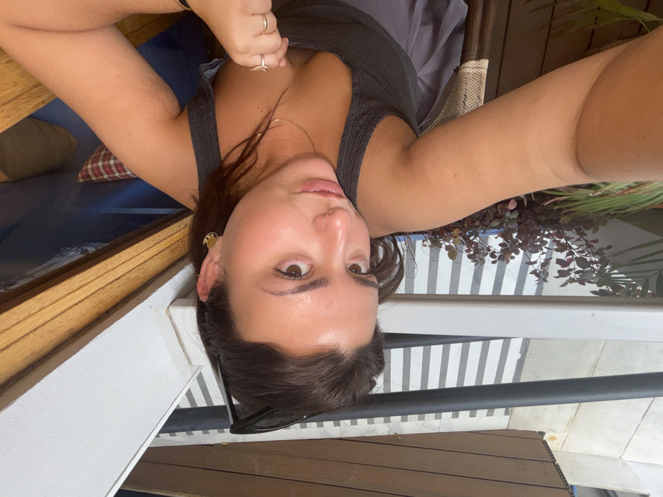 The image, rotated 90 degrees clockwise from a standard portrait orientation, captures a close-up of a young adult female in an outdoor setting, identified as Larnaca, Cyprus