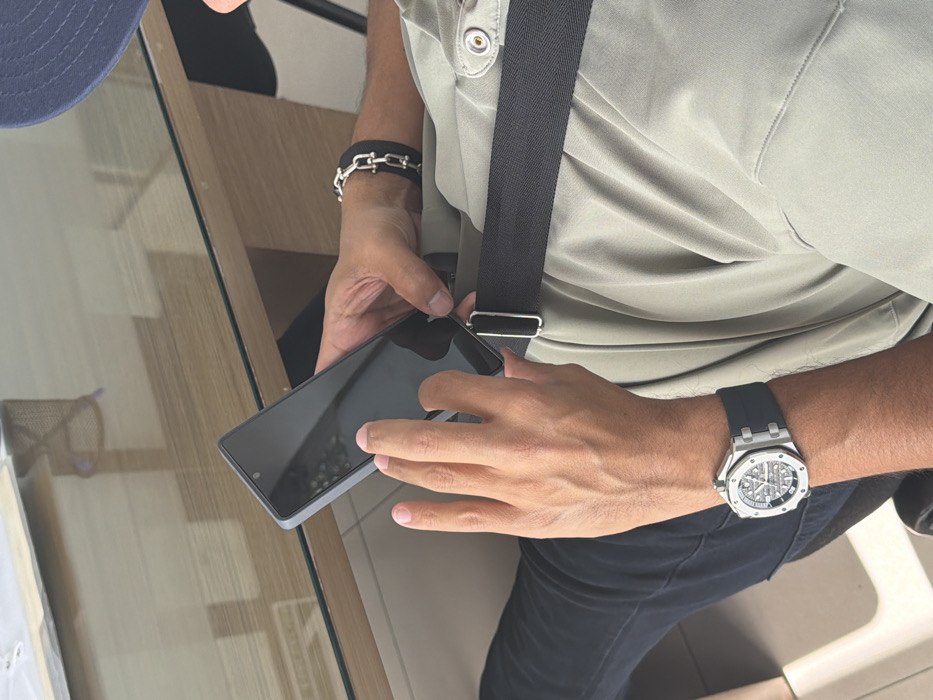 A person wearing a light-colored button-down shirt and dark jeans is using a smartphone. The phone is held in their left hand. They wear a watch with a dark strap on their right wrist and a bracelet on their left. A dark strap crosses their body. The photo is taken from an overhead perspective, showing a partial view of a table with a reflective surface.