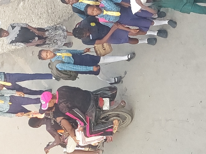 A group of uniformed students with yellow ties and white socks are gathered on a street. Some are standing while others are on a motorcycle with an adult. The motorcycle has a license plate. There are other adults visible nearby. The scene appears to be a street in front of a building with pavement.