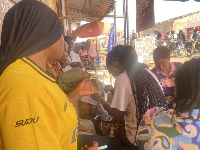 The image displays an outdoor or semi-outdoor street scene in Kaduna South, Nigeria, featuring multiple individuals engaged in daily activities during daylight hours. In the left foreground, a person, observed from the rear, wears a black headscarf and a yellow t-shirt with "SUDU" printed in black on the left sleeve. This individual holds a small, light green rectangular object in their right hand. To the right and slightly behind, another female individual is seated, viewed from the rear, wearing a light-colored top and exhibiting long, dark braided hair. She appears to be actively engaged with her hands, possibly performing hair braiding or a similar task. A tablet or smartphone is visible on her lap. Adjacent to her, a female individual in a purple top and a brown head covering looks downwards, with a visible band of what appears to be Nigerian naira notes draped across her chest. Other individuals are partially visible in the mid-ground, including one holding a small child. The background reveals a busy street or market environment. Numerous individuals, predominantly males, are present alongside several motorbikes (okadas). Buildings with light-colored facades line the street. Commercial activity is indicated by visible market stalls, banners, and at least one red umbrella, potentially branded 'Airtel'. The scene is illuminated by bright natural light.