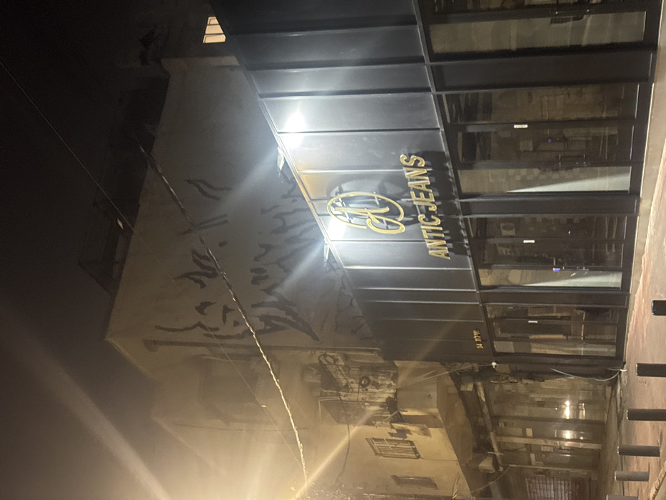 The image depicts an urban street scene at night in Tel-Aviv, Israel, specifically on Yehuda Hayamit Street, as indicated by the faded Hebrew text "יהודה 54" (Yehuda 54) visible on the modern storefront. To the right, a contemporary commercial establishment named "ANTIC JEANS" is prominently featured. Its facade is dark, composed of vertical panels, and features large glass entry doors. A gold-colored, stylized logo, resembling intertwined letters 'A' and 'J', is centered above the capitalized text "ANTIC JEANS." Two bright spotlights illuminate the signage from below. To the left of the "ANTIC JEANS" store, an older, multi-story building stands. Its exterior appears weathered, with sections of discoloration and visible wear on its facade. Features include multiple windows and at least one balcony with a deteriorated railing. The upper wall of this building, above the "ANTIC JEANS" store, displays large, dark, faded markings or graffiti. The street level in the foreground consists of dark pavement, along which several dark, cylindrical bollards are arranged. The scene is illuminated by artificial light sources, including the storefront spotlights and a strong, diffused light source, likely a streetlamp, originating from the far left, casting visible light rays and reflections that suggest atmospheric moisture or haze. The sky overhead is dark. Utility wires traverse the upper portion of the frame. No individuals or specific actions are discernible within the image.