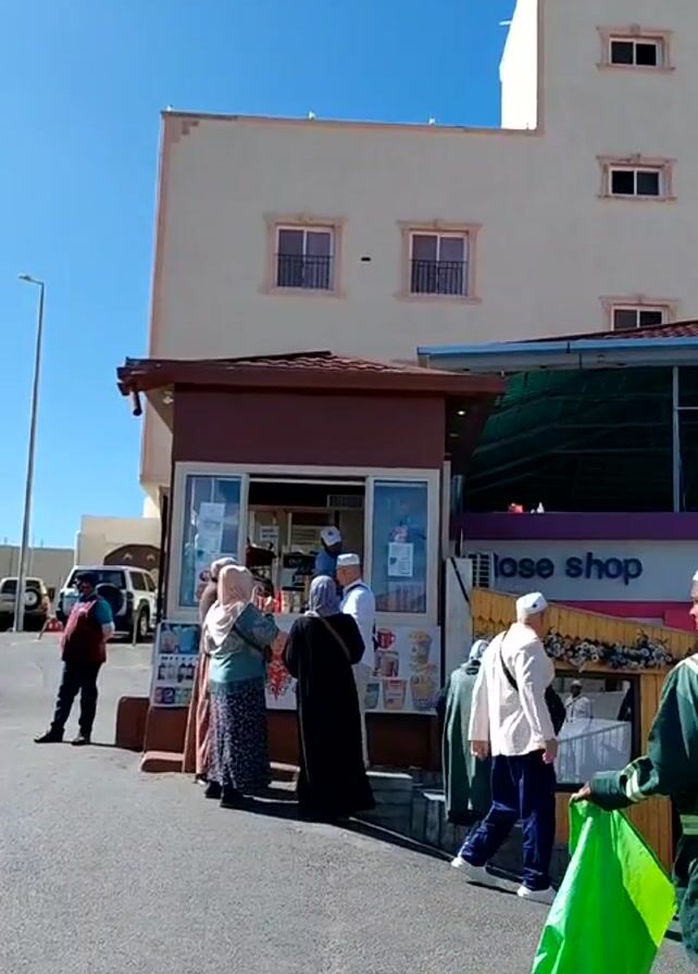 group of people in front of a small stand and a shop with Arabic and English writing. Several people are wearing traditional Muslim attire, including hijabs for women and skullcaps for men. Some are gathered around a brown stand with windows, appearing to order or receive items from a man inside. Adjacent to the stand is a pink and white shop with a sign that reads "Rose shop" in English and Arabic, as well as "Bakso Malang" written above. The shop appears to be connected to another pink building. People are walking around, some entering the shop. The buildings are located in a paved area with a few parked cars and trees in the background. The sky is clear and blue.